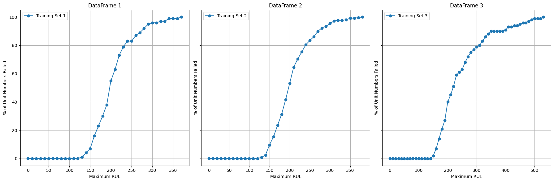 Remaining Useful Life (RUL) estimates how long an asset can operate before failure based on degradation patterns in sensor data. The curves show a slow early-life phase followed by a sharp rise in failures as assets approach end of life, with RUL ≈ 100 marking a key transition where degradation accelerates and failure risk increases. This insight helps define the optimal window for proactive, data-driven maintenance decisions.