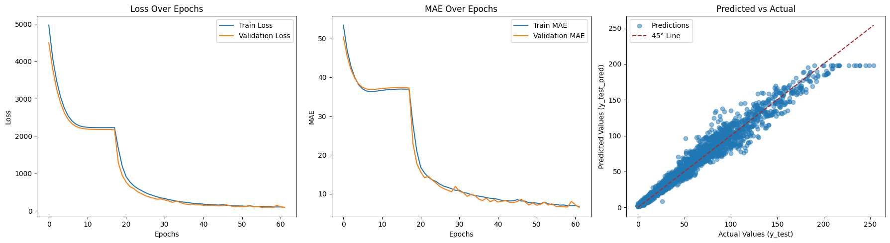 The LSTM model shows stable and consistent convergence, with both training and validation loss decreasing smoothly over epochs. The close alignment between training and validation curves indicates strong generalization and minimal overfitting. Mean Absolute Error steadily declines and stabilizes at a low level, demonstrating reliable predictive accuracy. The predicted versus actual plot shows a strong linear relationship, with most points closely following the 45-degree reference line. This indicates the model captures the underlying temporal patterns effectively across the target range. The stacked LSTM architecture with dropout provides sufficient capacity without unnecessary complexity. Overall, the results suggest the model is robust, well-regularized, and suitable for production use.